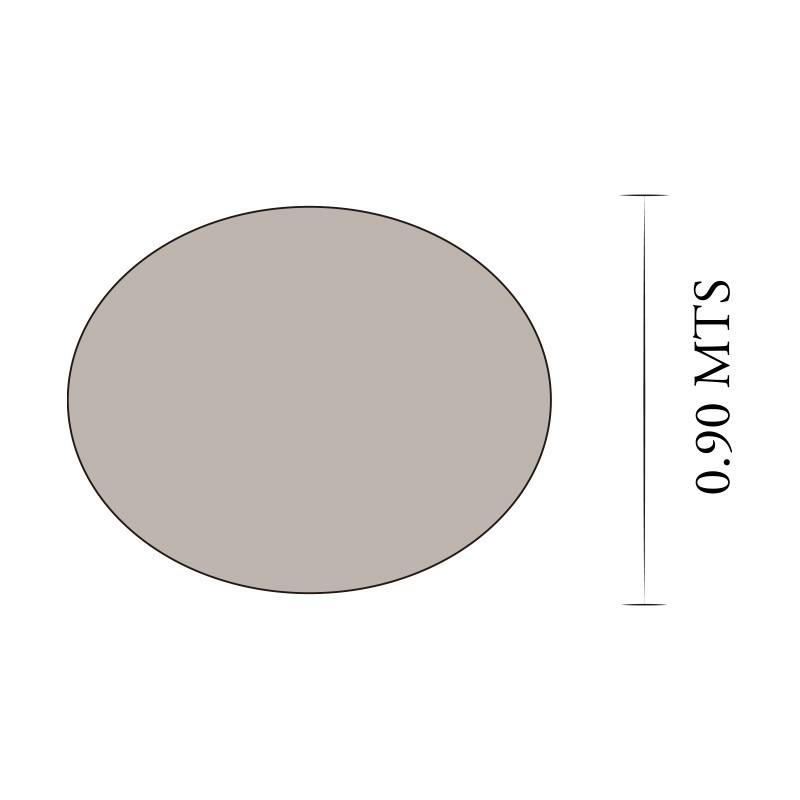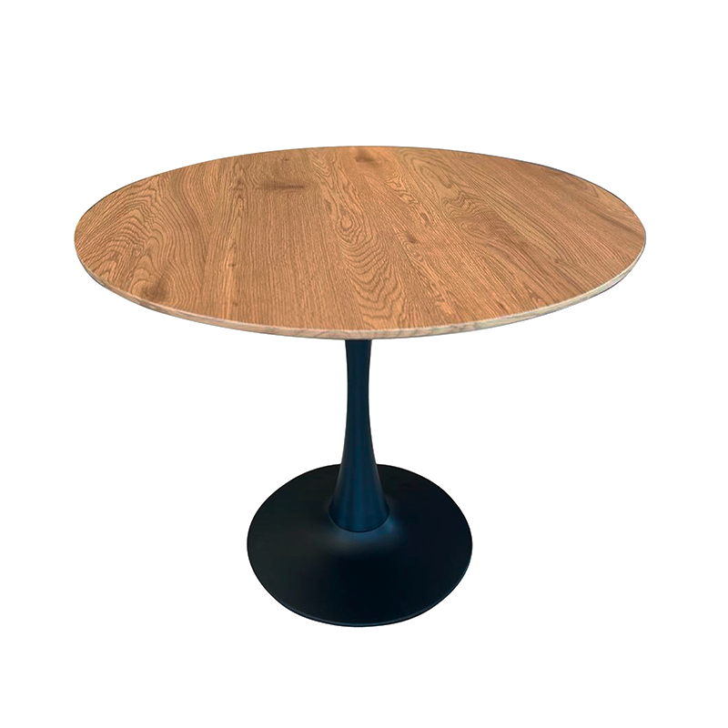 Mesa de tapa circular con acabado simil madera y base central de tipo tulip de metal, con acabado negro.