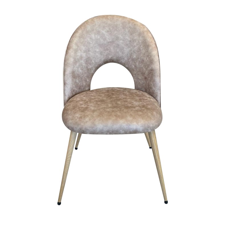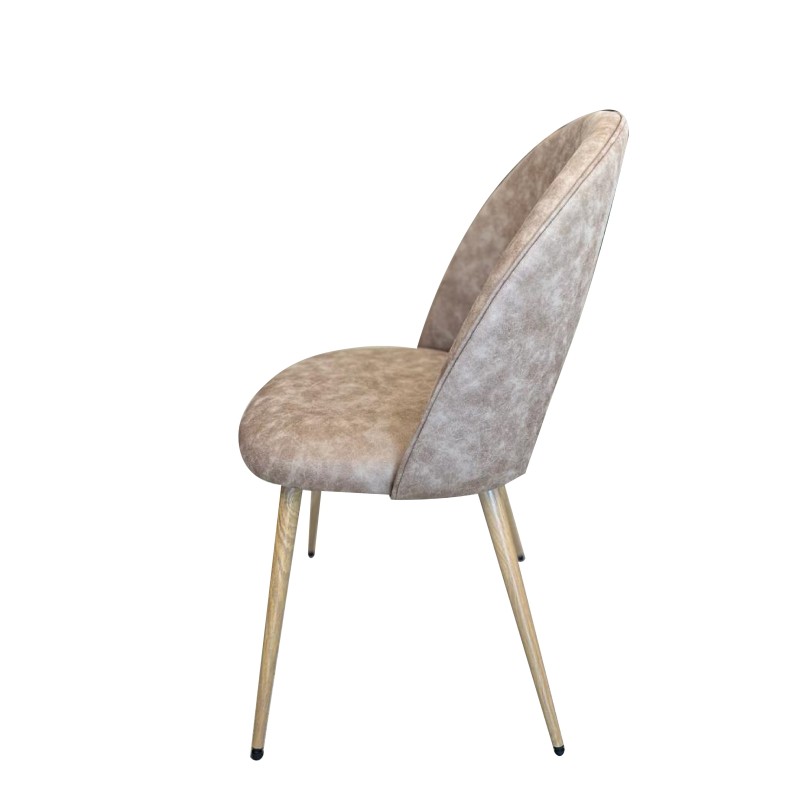 Silla con respaldo curvo y patas cilíndricas de estilo nórdico con acabado simil madera.