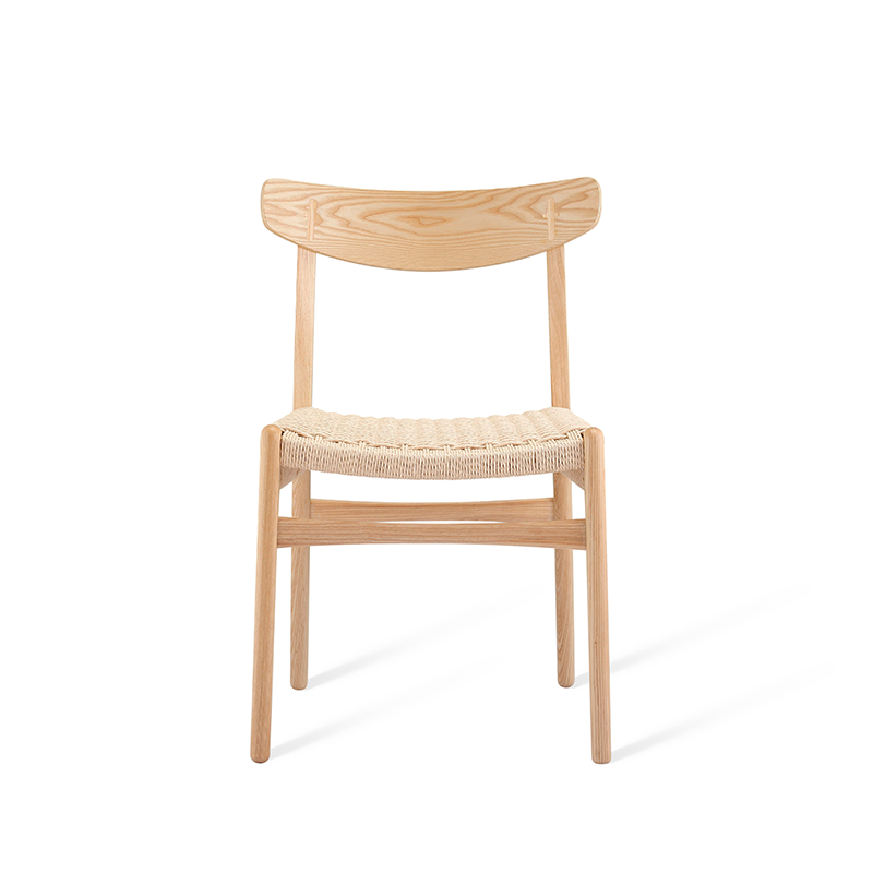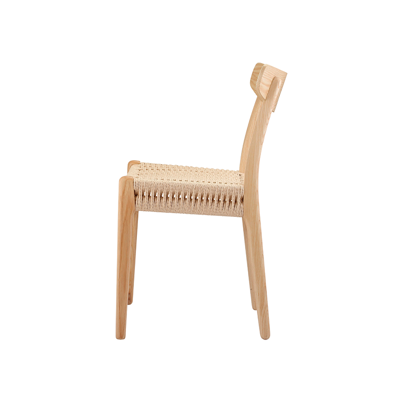 Silla con estructura y respaldo de madera de haya, con asiento tejido de fibra.